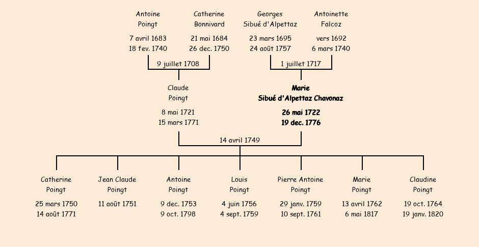 Père : Georges Sibué d'Alpettaz Chavonaz | Parrain : Ambroise Poingt (fils de Félix décédé) |