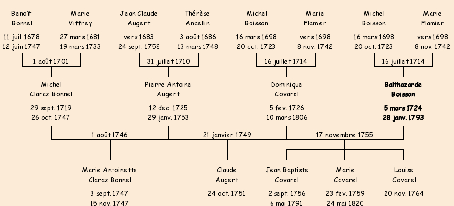 Epouse : Balthazarde Boisson (veuve de Michel Claraz Bonnel et de Pierre Antoine Augert), fille de Jean Baptiste |