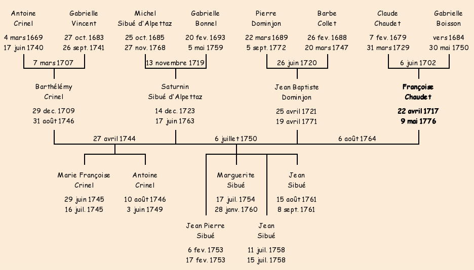 Mariée (33 ans) avec Saturnin Sibué d'Alpettaz (26 ans) le 6 juillet 1750 à Fontcouverte ![]() |