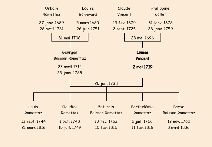 Mariée (19 ans) avec Georges Boisson Romettaz (24 ans) le 25 juin 1738 à Fontcouverte ![]() |