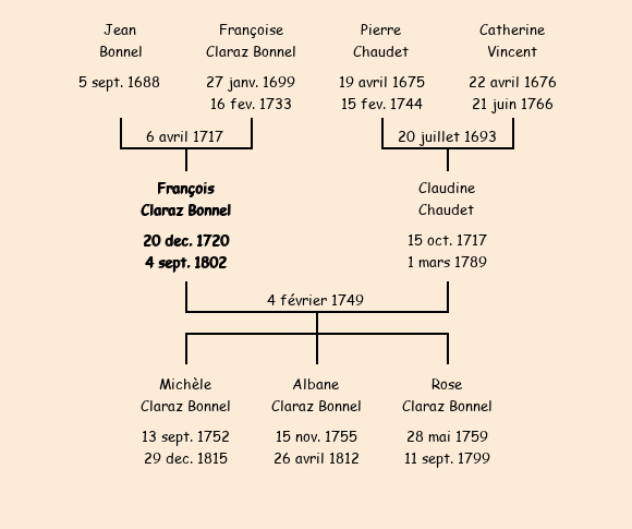 Mère : Françoise Bonnel | Marraine : Marie Claraz Bonnel (fille du parrain) |