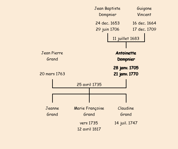 Mariée (30 ans) avec Jean Pierre Grand le 25 avril 1735 à Saint-Jean-de-Maurienne |