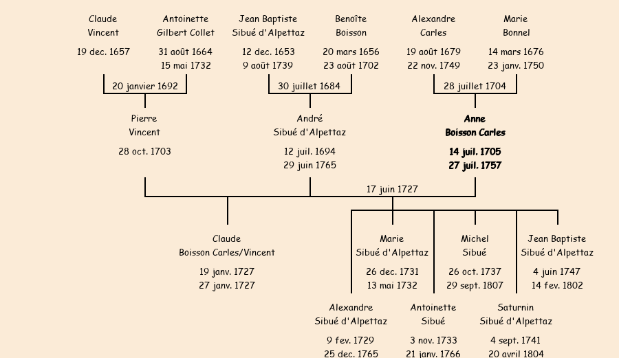Mariée (21 ans) avec André Sibué d'Alpettaz (32 ans) le 17 juin 1727 à Fontcouverte ![]() |