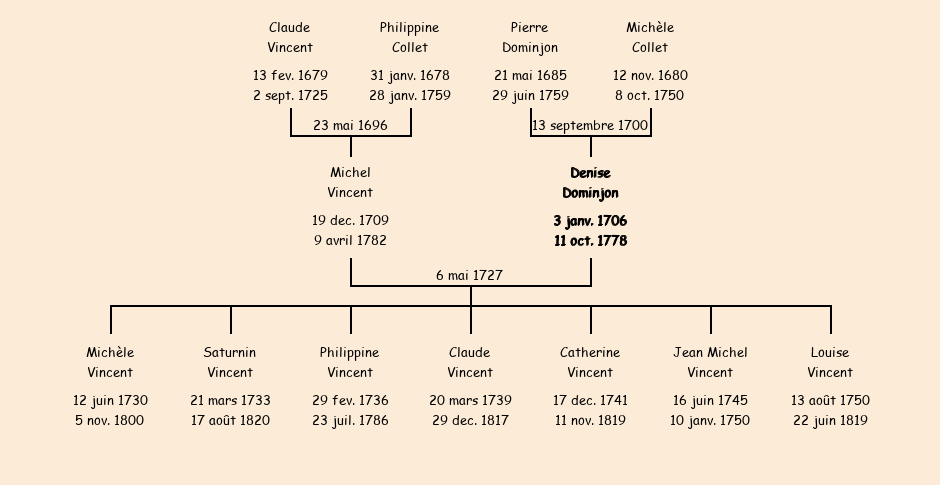 Denise Dominjon apparait dans la consigne du sel pour l'année 1734. |
