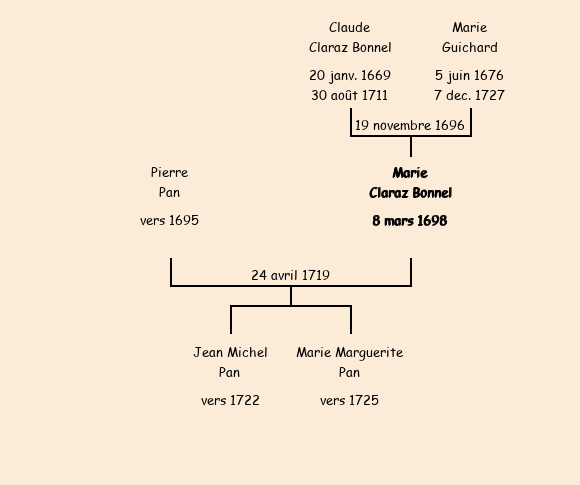 Mariée (21 ans) avec Pierre Pan (24 ans) le 24 avril 1719 à Saint-Jean-de-Maurienne ![]() |