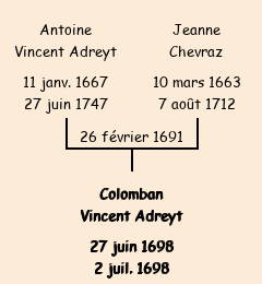 Père : Antoine Vincent Adreyt | Parrain : Colomban Chatain (fils de Michel) |
