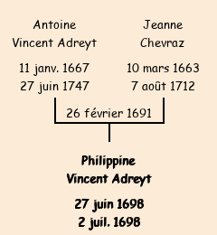 Mère : Jeanne Chevraz | Marraine : Philippine Vincent Adreyt (fille du dit Jean Baptiste (cf acte de Colomban)) |