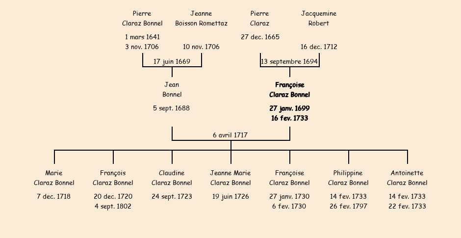 Françoise Claraz Bonnel apparait dans le recensement de la population de 1716. |