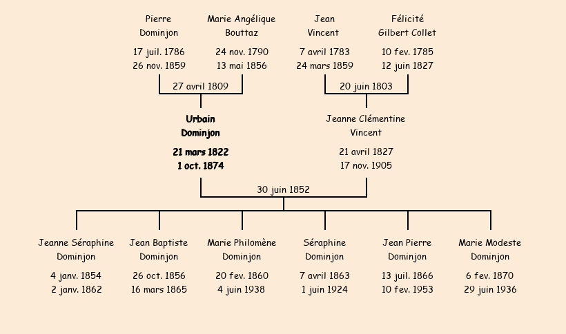 Epoux : Urbain Dominjon (30 ans, a marqué), fils de Pierre (a marqué) et de Angélique Bouttaz |