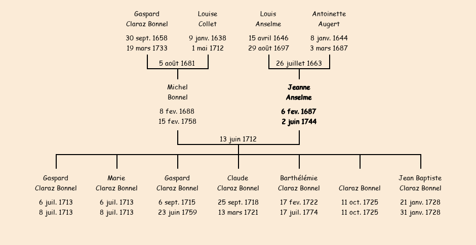 Mariée (25 ans) avec Michel Bonnel (24 ans) le 13 juin 1712 à Fontcouverte ![]() |