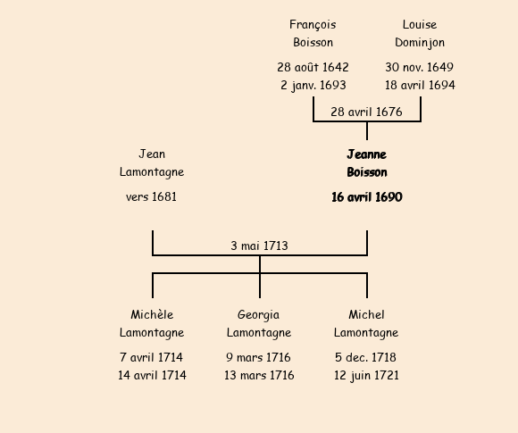 Mariée (23 ans) avec Jean Lamontagne (32 ans) le 3 mai 1713 à Fontcouverte ![]() |