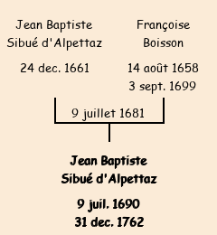 Père : Jean Baptiste Sibué d'Alpettaz | Parrain : Jean Baptiste Viffrey Bullière (fils de Pierre décédé, frère de la marraine) |