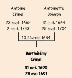 Père : Antoine Crinel | Parrain : Barthélémy Crinel (fils d'Urbain, frère de la marraine) |