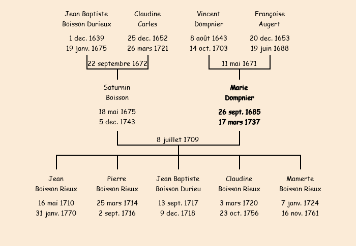 Mariée (23 ans) avec Saturnin Boisson (34 ans) le 8 juillet 1709 à Fontcouverte ![]() |