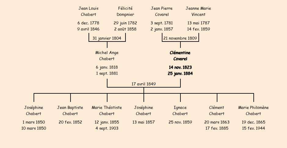 Epouse : Clémentine Covarel (25 ans, a marqué), fille de Jean Pierre (a signé) et de Jeanne Vincent |