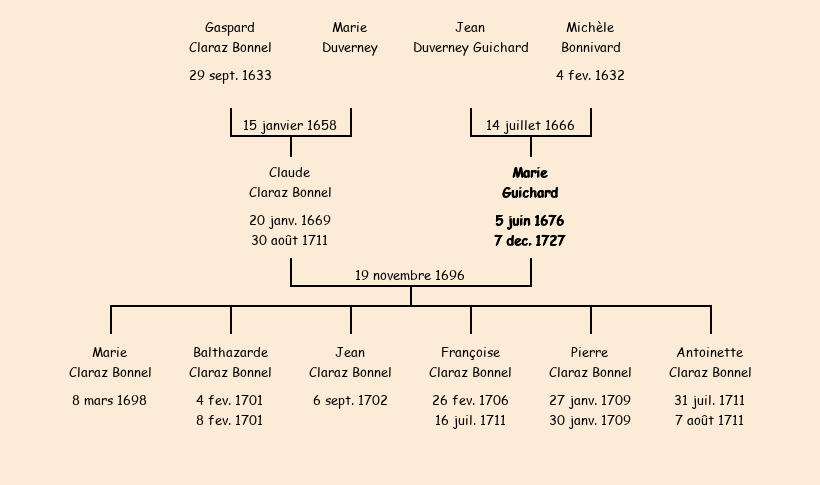 Mariée (20 ans) avec Claude Claraz Bonnel (27 ans) le 19 novembre 1696 ![]() |