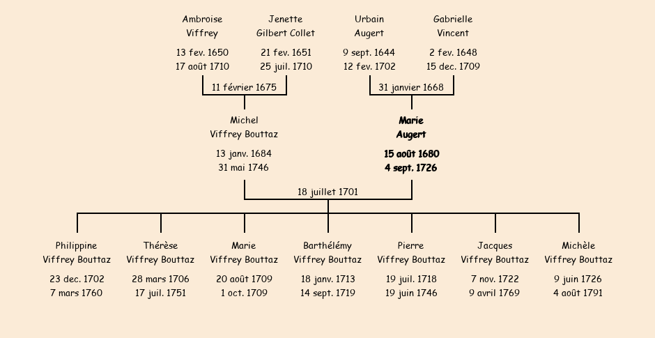 Mariée (20 ans) avec Michel Viffrey Bouttaz (17 ans) le 18 juillet 1701 à Fontcouverte ![]() |
