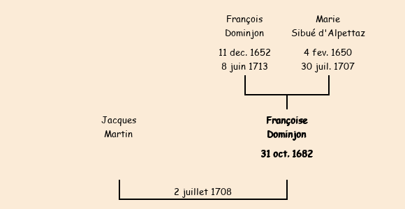 Mariée (25 ans) avec Jacques Martin le 2 juillet 1708 à Saint-Jean-de-Maurienne ![]() |