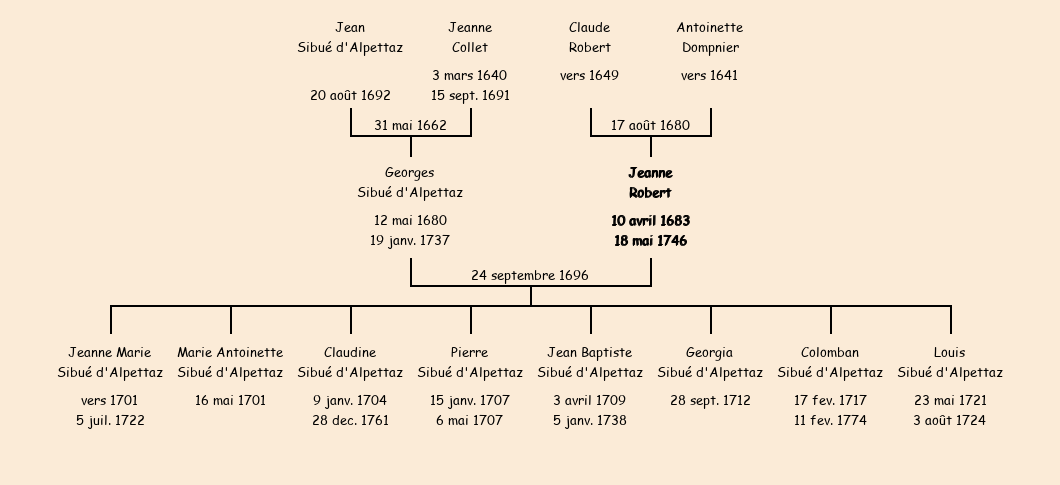 Mariée (13 ans) avec Georges Sibué d'Alpettaz (16 ans) le 24 septembre 1696 à Fontcouverte ![]() |