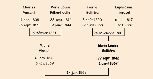 Epoux : Michel Vincent (21 ans, né le06 janvier 1842, cultivateur, a signé), fils de Charles (meunier, a signé) et de Marie Louise Gilbert Collet (décédée le 19 janvier 1844) |