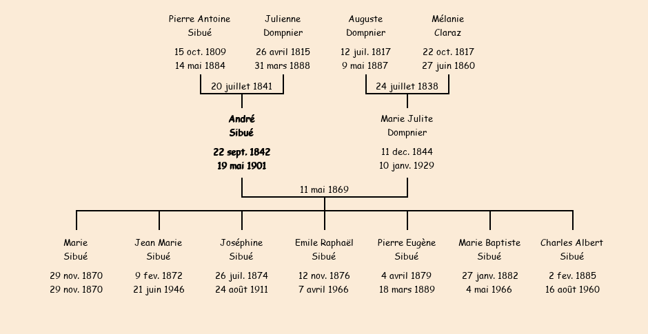 Epoux : André Sibué (26 ans, né le 22 septembre1842, cultivateur à la Bise, a signé), fils de Pierre Antoine (cultivateur, a signé) et de Julienne Dompnier (cultivatrice, n'a pas su signer) |