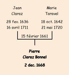 Père : Jean Claraz Bonnel, fils de Jean Baptiste | Parrain : Pierre Claraz Bonnel (fils du susdit Jean Baptiste) |