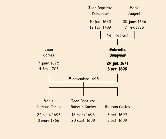 Mariée (24 ans) avec Jean Carles (20 ans) le 15 novembre 1695 à Fontcouverte ![]() |