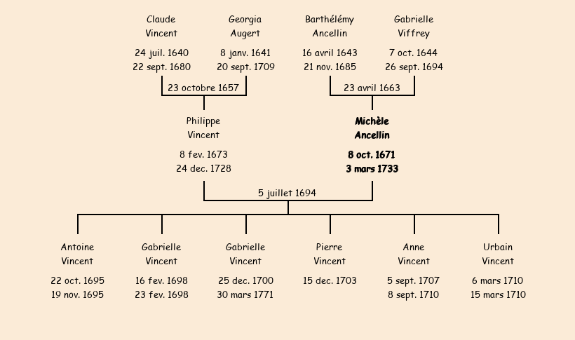 Mariée (22 ans) avec Philippe Vincent (21 ans) le 5 juillet 1694 à Fontcouverte ![]() |
