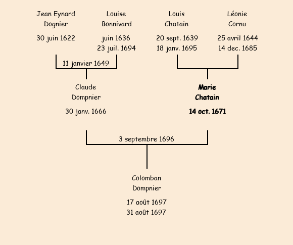 Mariée (24 ans) avec Claude Dompnier (30 ans) le 3 septembre 1696 à Fontcouverte ![]() |