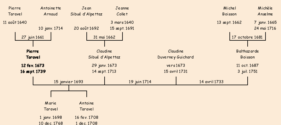 Epoux : Pierre Taravel (veuf de Claudine Duverney Guichard), fils de Pierre |