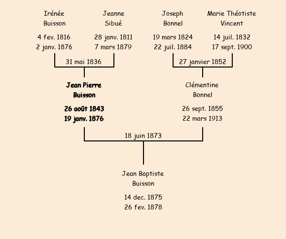 Père : Irénée Buisson, fils de Jean Pierre (laboureur) | Parrain : Jean Pierre Buisson (laboureur) |