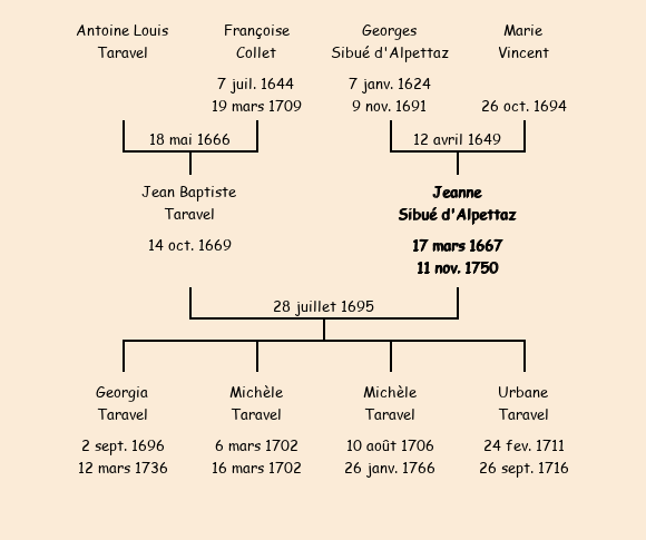 Mariée (28 ans) avec Jean Baptiste Taravel (25 ans) le 28 juillet 1695 à Fontcouverte ![]() |