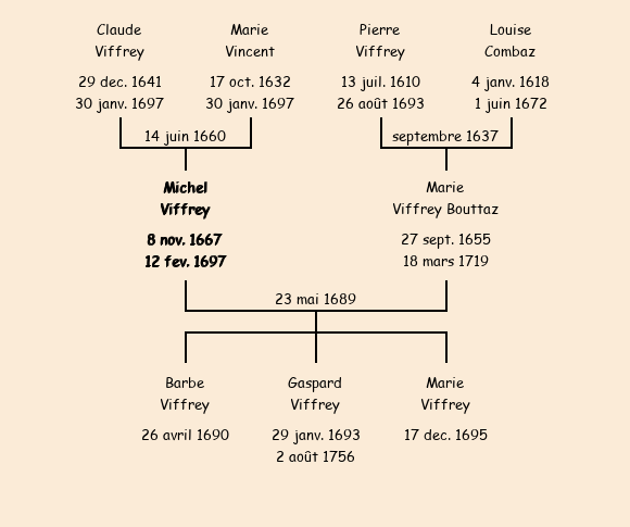 Marié (21 ans) avec Marie Viffrey Bouttaz (33 ans) le 23 mai 1689 à Fontcouverte ![]() |