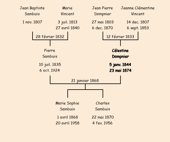 Epouse : Célestine Dompnier (24 ans, née le 5 janvier 1844, de La Maison Blanche, cultivatrice, a signé), fille de Jean Pierre (cultivateur, a signé) et de Jeanne Clémentine Vincent (décédée le 6 septembre1853) |