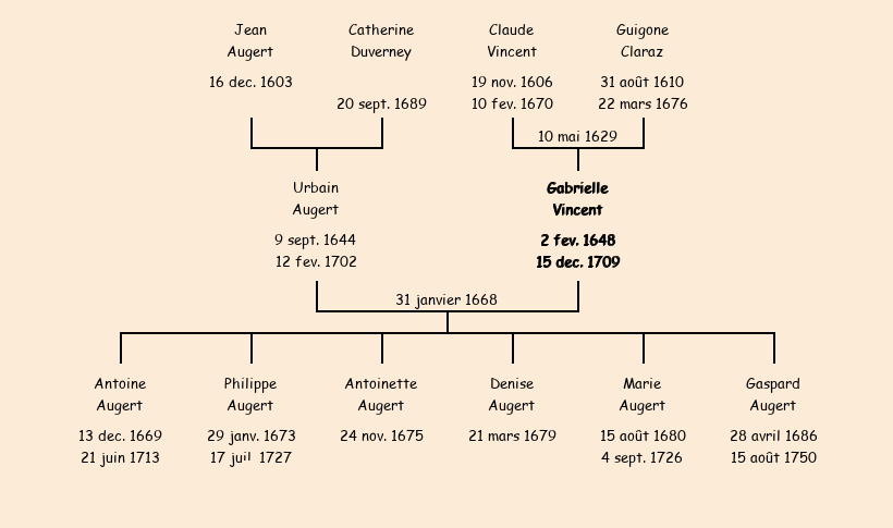 Mariée (19 ans) avec Urbain Augert (23 ans) le 31 janvier 1668 à Fontcouverte ![]() |