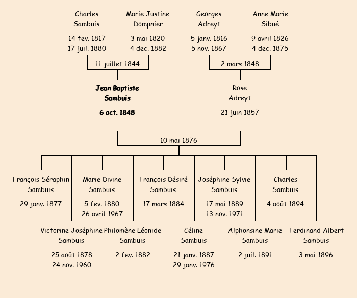 Epouse : Rose Adreyt (19 ans, née le 21 juin1857 à Fontcouverte, du Villard, cultivatrice, a signé), fille de Georges (décédé le 6 novembre1867, charpentier habitant de son vivant à Saint Jean d'Arves) et de Anne Marie Sibué (décédée le 4 décembre1875 à Foncouverte)