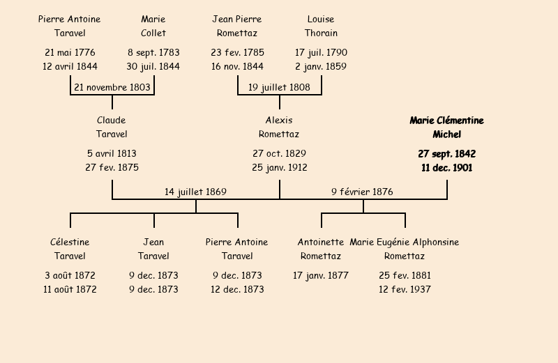 Epoux : Alexis Romettaz (47 ans, né le 17 octobre1829 (27 octobre), cultivateur à Charvin, veuf de Victoire Sibué décédée le 24 mai1869, a signé), fils de Jean Pierre (cultivateur, décédé le 16 novembre1844, n'a pas signé) et de Louise Thorain (décédée le 2 janvier 1859) |