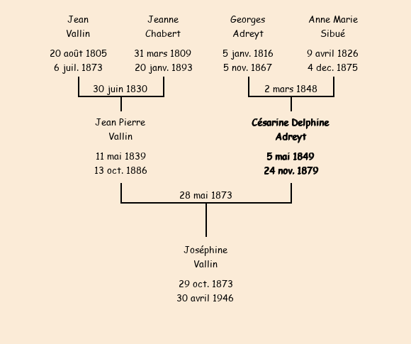 Epouse : Césarie Delphine Adreyt (24 ans, née à Saint Jean d'Arves 5 mai1849, du Villard, cultivatrice, a signé), fille de Georges (décédé le 5 novembre1867, de son vivant charpentier à Saint Jean d'Arves) et de Anne Marie Sibué (ménagère de Fontcouverte, a signé) |