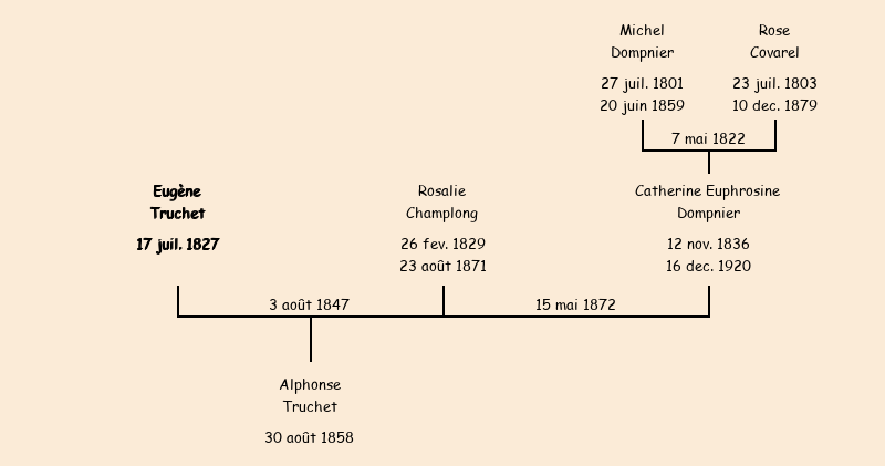 Epoux : Eugène Truchet (44 ans, né le 17 juillet1827, cultivateur à Saint Pancrace, veuf de Rosalie Champlong ménagère à Saint Pancrace décédée le 23 août1871 à Saint Pancrace, a signé), fils de Pierre (décédé à Saint Pancrace le 1er novembre1842) et de Marie Josephte Champlong (décédée le 23 août1862) |