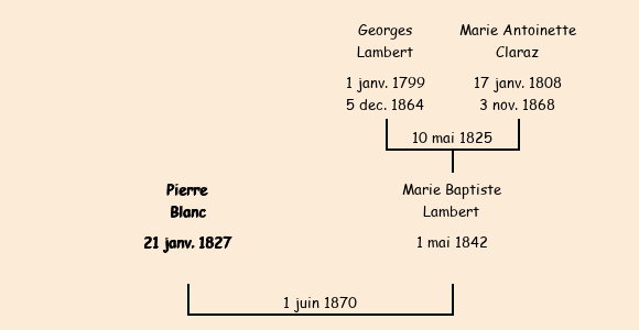 Epouse : Marie Baptiste Lambert (28 ans, née le 1er mai1842 à Fontcouverte, sans profession depuis 6 mois à Saint Jean, a signé), fille de Georges (décédé le 5 décembre1864) et de Marie Antoinette Claraz (décédée le 3 novembre1868) |