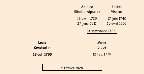 Epoux : Louis Constantin (d'Albiez le Vieux, veuf de Jeanne Marie Constantin), fils de feu Jacques et de feue Louise Julien |