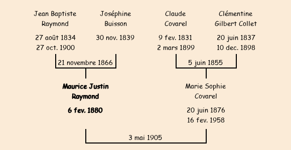 Epoux : Maurice Justin Raymond (25 ans né le 6 février1880 à Saint Pancrace où il habite), fils de Jean Baptiste (de Saint Pancrace, décédé à Saint Jean de Maurienne le 27 octobre1900) et de Séraphine Buisson (née à Fontcouverte le 30 novembre1839, domiciliée à Saint Pancrace) |