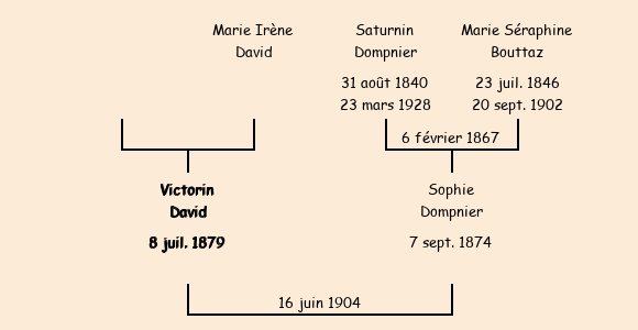 Epoux : Victorin David (25 ans, né à Montgilbert (Savoie) le 8 juillet1879, négociant boulanger à Aiguebelle), fils de Marie Irène David (ménagère à Aiguebelle) |