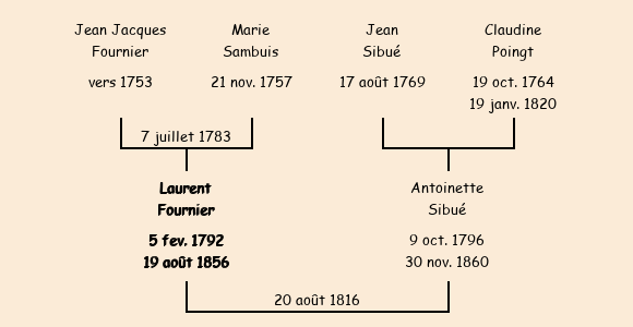 Epoux : Laurent Fournier, fils de Jean Jacques (d'Albiez le Vieux) et de Marie Sambuis (d'Albiez le Vieux) |