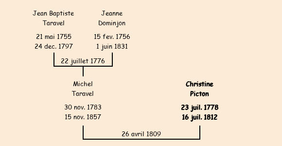 Epoux : Michel Taravel, fils de feu Jean Baptiste et de Jeanne Dominjon |