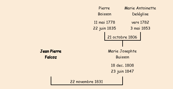 Epoux : Jean Pierre Falcoz (de Saint Jean d'Arves), fils de feu Marcel et de feue Dorothée Roche |