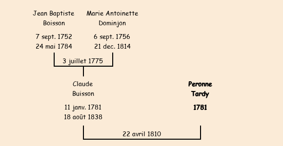 Epoux : Claude Buisson, fils de feu Jean Baptiste et de Marie Antoinette Dominjon |