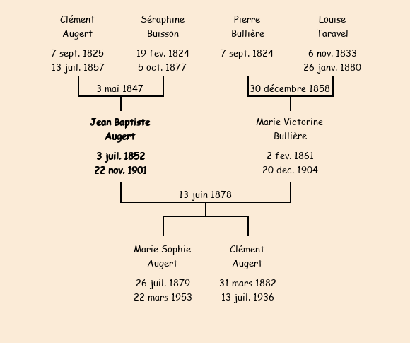 Epouse : Marie Victorine Bullière (17 ans, née le 4 février1861. (2 février), du Chef Lieu, cultivatirce, a signé), fille de Pierre (absent du pays) et de Louise Taravel (débitante de tabac au Chef Lieu, a signé) |