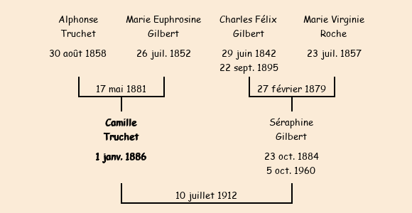Epoux : Camille Truchet (25 ans, né le 1er janvier 1886 au hameau des Fontaines à Saint Pancrace et domicilié au hameau des Fontaines à Saint Pancrace), fils de Alphonse (55 ans, domicilié à Saint Pancrace) et de Marie Gilbert (décédée à Saint Pancrace le 2 novembre1910) |
