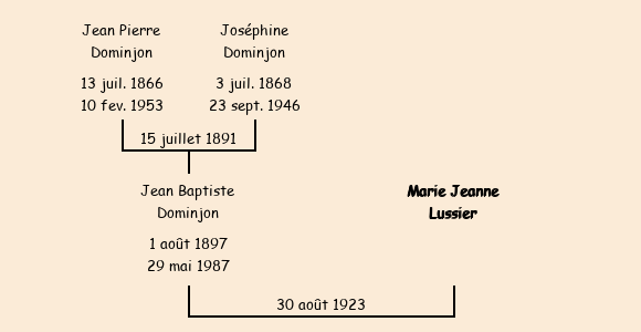 Epouse : Marie Jeanne Lussier (27 ans, née à Aix les Bains le 15 octobre1895, veuve de Joseph Victor Possety depuis le 14 février1922), fille de Maurice (domicilié à Aix les Bains, négociant) et de Jeannette Deloche |